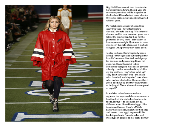 Gigi Hadid has to work hard to maintain her supermodel figure. The 21-year-old recently opened up to Elle magazine at the Reebok #NeverPerfect panel about a thyroid condition she's silently struggled with for years.
