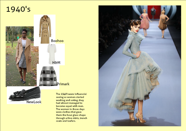 The 1940'swere influencial seeing as women started working and voting, they had almost managed to become equal with men. The women in those days wore clothes that gave them the hour glass shape through a-line skirts, trench coats and loafers.