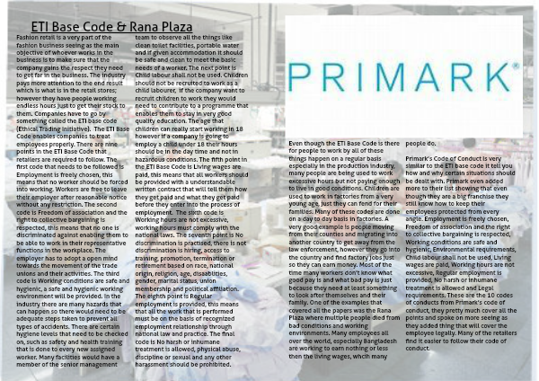 Primark’s Code of Conduct Is very similar to the ETI base code it tell you how and why certain situations should be dealt with. Primark even added more to their list showing that even though they are a big franchise they still know how to keep their employees protected from every angle. Employment is freely chosen, Freedom of association and the right to collective bargaining is respected, Working conditions are safe and hygienic, Environmental requirements, Child labour shall not be used, Living wages are paid, Working hours are not excessive, Regular employment is provided, No harsh or inhumane treatment is allowed and Legal requirements. These are the 10 codes of conducts from Primark’s code of conduct, they pretty much cover all the points and spoke on more seeing as they added thing that will cover the employee legally. Many of the retailers find it easier to follow their code of conduct.