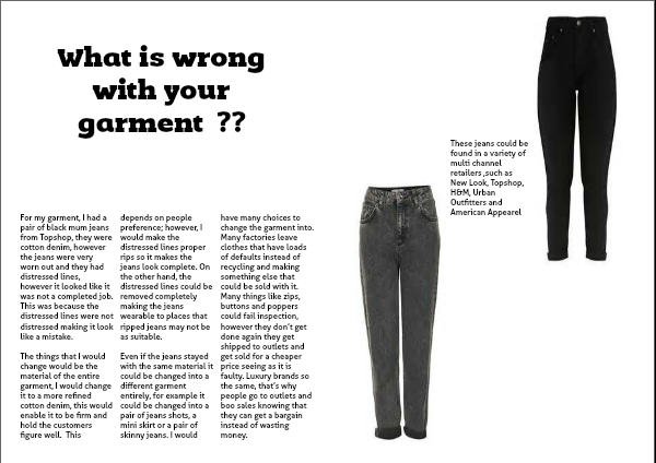 Even if the jeans stayed with the same material it could be changed into a different garment entirely, for example it could be changed into a pair of jeans shots, a mini skirt or a pair of skinny jeans. I would have many choices to change the garment into. Many factories leave clothes that have loads of defaults instead of recycling and making something else that could be sold with it. Many things like zips, buttons and poppers could fail inspection, however they don’t get done again they get shipped to outlets and get sold for a cheaper price seeing as it is faulty. Luxury brands so the same, that’s why people go to outlets and boo sales knowing that they can get a bargain instead of wasting money.