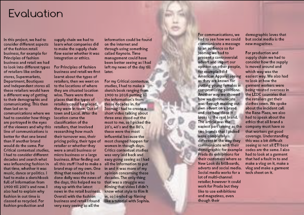 For communications, we had to see how we could communicate a message to an audience so for joomag we had to present a controversial advert and impart our opinion on other people, for example I did American Apparel seeing as they are known for putting young females in compromising positions. Another way we showed how we communicate was through making out own advert on a brand and see how close it looks to the real brand. The article was the easiest part seeing as the two brands that I picked were completely different in the way they communicate with their demographic for example Prada do exhibitions for their customers where as New Look do billboards, adverts and social media. Social media works for a lot of multi-channel retailer, however it could work for Prada but they like to use exhibitions and magazines, even though their demographic loves that but social media is the new magazines.
