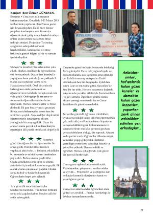 5 Mayıs ’ ta İstanbul Havaalanından yola çıktık . Herkes , özellikle de öğrencilerim çok heyecanlıydı . Düzce ’ den İstanbul ’ a yaptığımız kara yolculuğu ve yaklaşık 3 buçuk saat uçtuktan sonra Paris Havaalanına indik . Özel bir arabayla kalacağımız otele yerleşmek ve öğrencilerimizi ailelerle buluşturmak için yola çıktık . Otele gelip ilk tanışma ve sonrasında öğrencilerimizi evlerine uğurladık . Herkes odasına çıktı ve biraz dinlendi . İlk gün biraz yorucu geçmişti . Birkaç saat dinlenmeden sonra kısa bir şehir turu yaptık . Akşam diğer ekiplerdeki öğretmenlerle tanıştığımız akşam yemeğinde bir araya geldik . Uzun bir aradan sonra gerçek dil kullanıcılarıyla öğrettiğim dili pratik etmek çok değerliydi .