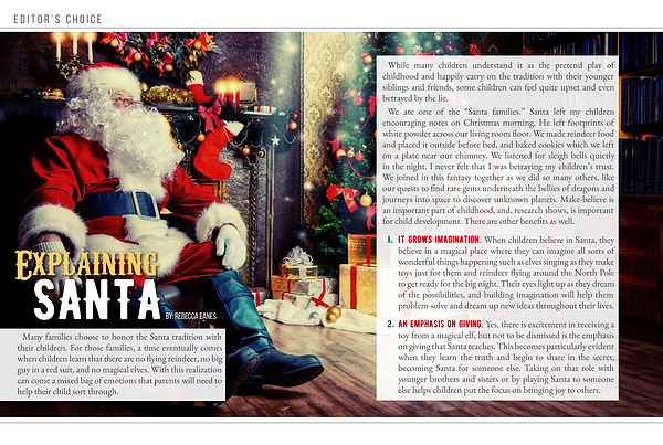 We are one of the“ Santa families.” Santa left my children encouraging notes on Christmas morning. He left footprints of white powder across our living room floor. We made reindeer food and placed it outside before bed, and baked cookies which we left on a plate near our chimney. We listened for sleigh bells quietly in the night. I never felt that I was betraying my children’ s trust. We joined in this fantasy together as we did so many others, like our quests to find rare gems underneath the bellies of dragons and journeys into space to discover unknown planets. Make-believe is an important part of childhood, and, research shows, is important for child development. There are other benefits as well.