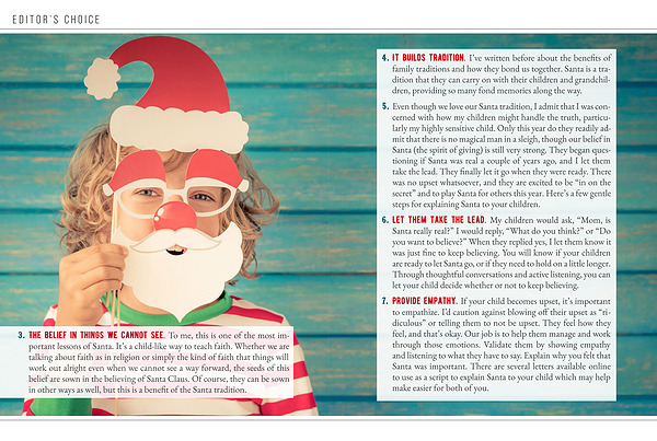 6. Let them take the lead. My children would ask,“ Mom, is Santa really real?” I would reply,“ What do you think?” or“ Do you want to believe?” When they replied yes, I let them know it was just fine to keep believing. You will know if your children are ready to let Santa go, or if they need to hold on a little longer. Through thoughtful conversations and active listening, you can let your child decide whether or not to keep believing.