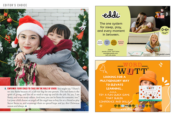 8. Empower your child to take on the role of giver. You might say,“ There’ s no one Santa because it’ s a job too big for one person. The real Santa is the spirit of giving, and lots of us need to step up and do the job. So, yes, I am Santa, and so are many others. And now, you can be Santa for someone, too.” Let your child choose an angel off the angel tree to buy for or a friend to play Secret Santa to, and encourage them to spread hope and joy this Christmas season and always.