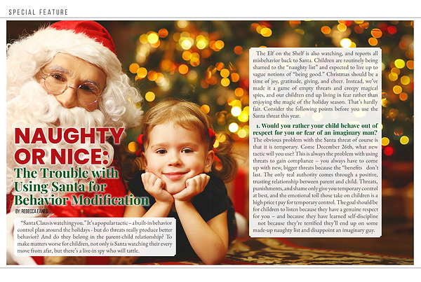 1. Would you rather your child behave out of respect for you or fear of an imaginary man? The obvious problem with the Santa threat of course is that it is temporary. Come December 26th, what new tactic will you use? This is always the problem with using threats to gain compliance – you always have to come up with new, bigger threats because the“ benefits” don’ t last. The only real authority comes through a positive, trusting relationship between parent and child. Threats, punishments, and shame only give you temporary control at best, and the emotional toll those take on children is a high price t pay for temporary control. The goal should be for children to listen because they have a genuine respect for you – and because they have learned self-discipline – not because they’ re terrified they’ ll end up on some made-up naughty list and disappoint an imaginary guy.