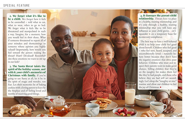 3. The Santa threat taints the spirit of the holiday season, and with it, your child’ s memories of Christmas with family. If you’ re going to use Santa at all, let it be in the spirit of magic and wonder, not fear. Let their memories be of baking cookies with a loving parent to leave by the fireplace and of feeling loved and worthy of receiving good things.