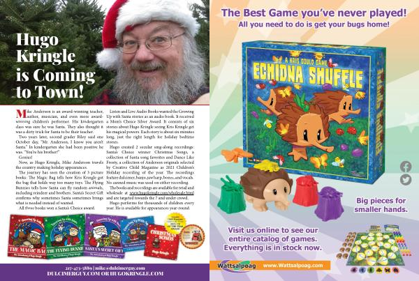 Hugo created 2 secular sing-along recordings : Santa ’ s Choice winner Christmas Songs , a collection of Santa song favorites and Dance Like Frosty , a collection of Anderson originals selected by Creative Child Magazine as 2021 Children ’ s Holiday recording of the year . The recordings feature dulcimer , banjo , jaw harp , bones , and vocals . No canned music was used on either recording .