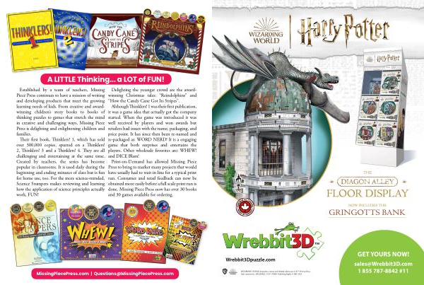 Delighting the younger crowd are the awardwinning Christmas tales : “ Reindolphins ” and “ How the Candy Cane Got Its Stripes ”. Although Thinklers ! 1 was their first publication , it was a game idea that actually got the company started . When the game was introduced it was well received by players and won awards but retailers had issues with the name , packaging , and price point . It has since then been re-named and re-packaged as : WORD NERD ! It is a engaging game that both surprises and entertains the players . Other wholesale favorites are : WHEW ! and DICE Blam ! Print-on-Demand has allowed Missing Piece Press to bring to market many projects that would have usually had to wait in line for a typical print run . Consumer and retail feedback can now be obtained more easily before a full scale print run is done . Missing Piece Press now has over 30 books and 30 games available for ordering .