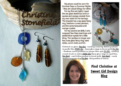 Cultured sea glass: P48-B30 – teardrop round tip drilled pendants in pacific blue, PMX7-B16 – fancy glass rings in desert gold, P16-B46 – freeform curved pendants in opaque blue opal, S77-B17 – teardrop rounds beads in amber, PMX7-B33 fancy glass rings in royal blue, P49-B16S – sand dollar pendant in desert gold, S29-B28S – conch shell in turquoise bay, P51-B84 – fish pendant in lemon.