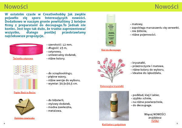 W ostatnim czasie w Creativehobby jak zwykle pojawiło się sporo interesujących nowości. Dodatkowo w naszym gronie powitaliśmy 2 kolejne firmy z preparatami do decoupage.To jednak nie koniec. Jest tego tak dużo, że trudno zaprezentować wszystko, dlatego poniżej przedstawiamy najciekawsze propozycje.