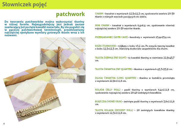Do tworzenia patchworków można wykorzystać tkaniny w różnej formie. Najwygodniejszy jest jednak zestaw zawierający już pocięte kawałki materiału. By nie pogubić się w gąszczu patchworkowej terminologii, przedstawiamy najczęściej spotykane wymiary gotowych tkanin wraz z ich nazwami.