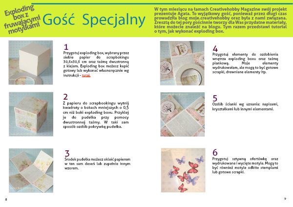 Przygotuj exploding box, wybrany przez siebie papier do scrapbokingu 30,5x30,5 cm oraz taśmę dwustronną z klejem. Exploding box możesz kupić gotowy lub wykonać własnoręcznie wg instrukcji - tutaj.