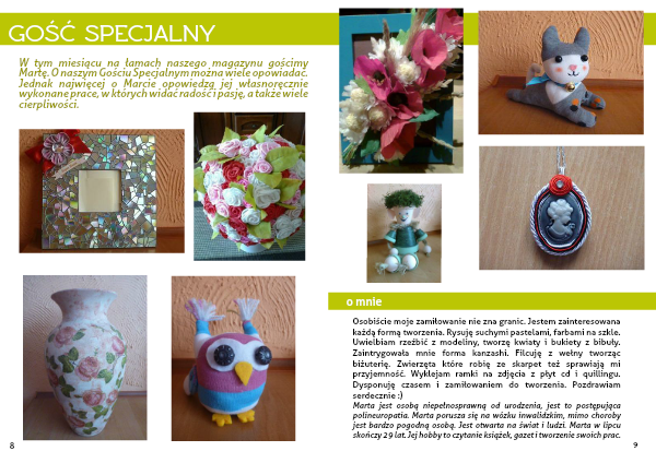 Marta jest osobą niepełnosprawną od urodzenia, jest to postępująca polineuropatia. Marta porusza się na wózku inwalidzkim, mimo choroby jest bardzo pogodną osobą. Jest otwarta na świat i ludzi. Marta w lipcu skończy 29 lat. Jej hobby to czytanie książek, gazet i tworzenie swoich prac.