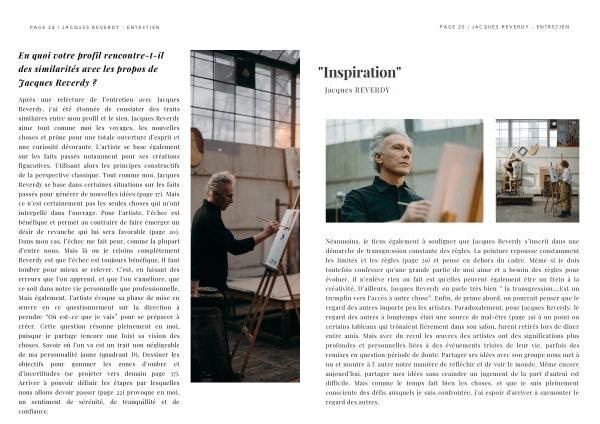 Néanmoins , je tiens également à souligner que Jacques Reverdy s ’ inscrit dans une démarche de transgression constante des règles . La peinture repousse constamment les limites et les règles ( page 29 ) et pense en dehors du cadre . Même si je dois toutefois confesser qu ’ une grande partie de moi aime et a besoin des règles pour évoluer , il n ’ enlève rien au fait est qu ' elles peuvent également être un frein à la créativité . D ’ ailleurs , Jacques Reverdy en parle très bien “ la transgression …. Est un tremplin vers l ’ accès à autre chose ”. Enfin , de prime abord , on pourrait penser que le regard des autres importe peu les artistes . Paradoxalement , pour Jacques Reverdy , le regard des autres à longtemps était une source de mal-être ( page 39 ) à un point ou certains tableaux qui trônaient fièrement dans son salon , furent retirés lors de dîner entre amis . Mais avec du recul les œuvres des artistes ont des significations plus profondes et personnelles liées à des événements tristes de leur vie , parfois des remises en question / période de doute . Partager ses idées avec son groupe nous met à nu et montre à l ' autre notre manière de réfléchir et de voir le monde . Même encore aujourd ’ hui , partager mes idées sans craindre un jugement de la part d ' autrui est difficile . Mais comme le temps fait bien les choses , et que je suis pleinement consciente des défis auxquels je suis confrontée , j ’ ai espoir d ’ arriver à surmonter le regard des autres .