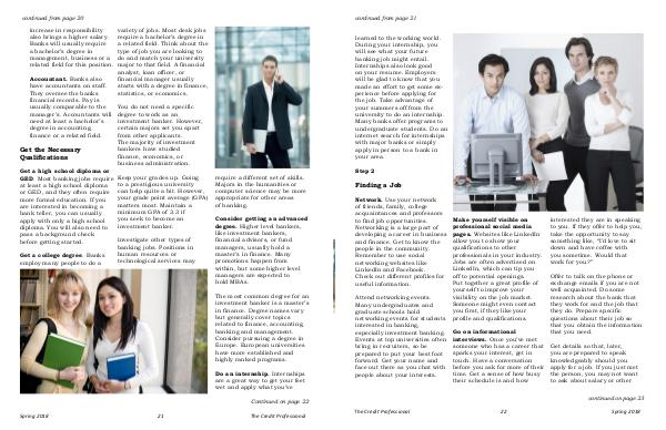 learned to the working world. During your internship, you will see what your future banking job might entail. Internships also look good on your resume. Employers will be glad to know that you made an effort to get some experience before applying for the job. Take advantage of your summers off from the university to do an internship. Many banks offer programs to undergraduate students. Do an internet search for internships with major banks or simply apply in person to a bank in your area.