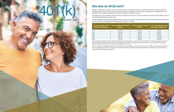 Here is an example : Assuming total eligible pay for a paycheck is $ 1,500.00 , here is how much you and the Company will contribute to your 401 ( k ) account , depending on the percentage you elect to contribute :