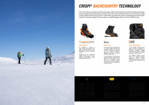 The Telemark revolution bears from the concept of a product of extraordinary performances. If a skier is constantly looking to dare well, Evo will satisfyevery single need taking him to the seventh heaven. This is the reason why the World Champions choose it! Shell and Cuff in Pebax ® with micrometrical buckles for a high level fitting; rear mechanism for a quick change from Walk to Ski mode. Maximum skiing stability thanks to the“ Carbon Side Support” system exclusively patented by CRISPI ®. The revolutionary cuff with double density injection gives rigidity and support; the special“ Bellow Flex Control” allows an out standing flexion. Available with CRISPI ® Dynamic Liner( Thermoformable). Compatible with NTN and Low Tech binding.