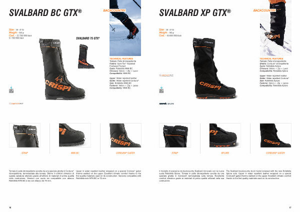 TECHNICAL FEATURES Flessione: Rigida Scafo: Pebax ® Carbon Suola: Vibram ® CRISPI ® Kogatz Evo Leve: Micrometriche Regolabili in Alluminio. Scarpetta: CRISPI ® Dynamic Liner Compatibilità: 75mm