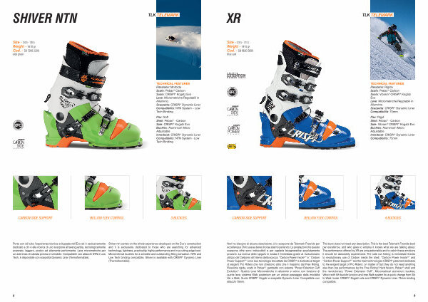 Over 50 years of Telemark experience and a complete range of products for all kind of telemark skiers is what CRISPI ® has to share with all of you introducing a full line including NTN system with Low Tech Inserts and classic 75mm which swings from the powerful XR with Carbon Power Frame to the little jewel XP with the well known CRISPI ® Carbon Side Support. We will guide you from the powerful carve on pist to the fascinating and wordless teleturns on powder, without forgetting your need of freedom on a ski touring day.