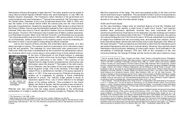 freemasonry influence Brougham’ s legal reforms? The same question can be asked of many other prominent figures in British history who were freemasons. In July 1885, the English masonic newspaper, The Freemason, listed members of the government and royal household who were freemasons. 24 Among those named by The Freemason were Sir Charles Dilke, President of the Local Government Board from 1882 to 1885, who was the leader of the radical faction within the Liberal party and the most eminent advocate of republicanism. Despite his republican views, Dilke became a close friend of the Prince of Wales. How far was this friendship fostered by their common freemasonry? Likewise, Dilke was close to French republican leaders such as Gambetta, who were also masons. The list in The Freemason also included one of Dilke’ s political opponents, Lord Randolph Churchill, father of Sir Winston Churchill. Lord Randolph was a populist Tory whose personality was one of the most puzzling in 19th-century politics. In the case of Lord Randolph, further investigation of his masonic career would be interesting for the extent to which it would assist in interpreting his difficult character.