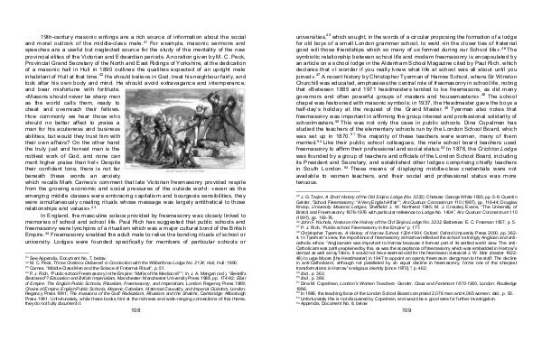 universities, 45 which sought, in the words of a circular proposing the formation of a lodge for old boys of a small London grammar school, to weld « in the closer ties of fraternal good will those friendships which so many of us formed during our School life ». 46 The symbiotic relationship between school life and modern freemasonry is encapsulated by an article on a school lodge in the Aldenham School Magazine cited by Paul Rich, which declares that « I wonder if you really knew what life at school was all about until you joined ». 47 A recent history by Christopher Tyerman of Harrow School, where Sir Winston Churchill was educated, emphasises the central role of freemasonry in school life, noting that « Between 1885 and 1971 headmasters tended to be freemasons, as did many governors and often powerful groups of masters and housemasters ». 48 The school chapel was festooned with masonic symbols; in 1937, the Headmaster gave the boys a half-day’ s holiday at the request of the Grand Master. 49 Tyerman also notes that freemasonry was important in affirming the group interest and professional solidarity of schoolmasters. 50 This was not only the case in public schools. Dina Copelman has studied the teachers of the elementary schools run by the London School Board, which was set up in 1870. 51 The majority of these teachers were women, many of them married. 52 Like their public school colleagues, the male school board teachers used freemasonry to affirm their professional and social status. 53 In 1876, the Crichton Lodge was founded by a group of teachers and officials of the London School Board, including its President and Secretary, and established other lodges comprising chiefly teachers in South London. 54 These means of displaying middle-class credentials were not available to women teachers, and their social and professional status was more tenuous.