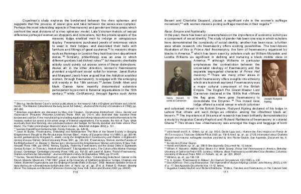 Copelman’ s study explores the borderland between the « two spheres » and suggests that the process of social give and take between the sexes was complex. Perhaps the most interesting aspects of freemasonry and gender are those areas which confront the neat divisions of a « two spheres » model. Late Victorian rhetoric of sexual difference portrayed women as shoppers and consumers, but the private spaces of the masonic lodge enabled men to indulge in conspicuous display. Freemasons purchased jewels of enormous value to wear in their lodges, and decorated their halls with furniture and fittings of great opulence. 55 In masonic shops such as Kennings in London they had their own department stores. 56 Similarly, philanthropy was an area in which different genders had distinct roles. 57 but masonic charitable activity could quietly cut across some of these distinctions. Above all, in the other direction, women’ s freemasonry provided a significant social outlet for women. Janet Burke and Margaret Jacob have argued that the Adoption enabled women, through freemasonry, to engage with the emerging civil society in the 18th century. 58 James Smith Allen and Mark Carnes have recently documented extensive participation by women in fraternal organisations in the 19th century, 59 while Co-Masonry, through figures such Annie