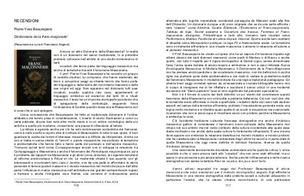 Il prof. Pierre-Yves Beaurepaire ha raccolto un gruppo di ventotto studiosi, lui compreso, che hanno elaborato dei brevi e scrupolosi saggi su ottanta lemmi che fanno parte del linguaggio e della storia del movimento massonico dalle sue origini ad oggi. Non appaiono nel dizionario tutti quei vocaboli, eccetto qualche raro caso, appartenenti al linguaggio simbolico ed esoterico dei tanti riti e rituali massonici; il testo ha un’ impronta storiografica piuttosto che di spiegazione delle simbologie, seguendo forse l’ indicazione di Goethe quando disse che la Massoneria non è cosa che si può spiegare.