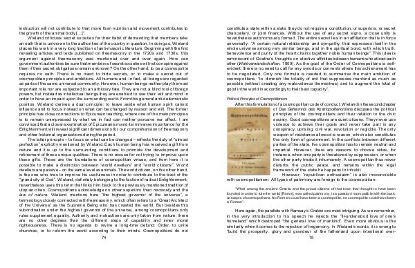The latter principle – to focus on what can be changed – reflects the duty of“ utmost perfection” explicitly mentioned by Wieland. Each human being has received a gift from nature and it is up to the surrounding conditions to promote the development and refinement of those unique qualities. There is no excuse for not trying to improve upon those gifts. These are the foundations of cosmopolitan virtues, and from here it is possible to make a distinction between“ world dwellers” and“ world citizens”. World dwellers are passive – on the same level as animals. The world citizen, on the other hand, is the one who tries to improve his usefulness in order to contribute to the best of the“ grand city of God”. Wieland, definitely belonging to the faction of radical Enlightenment, nevertheless uses this term that links him back to the previously mentioned tradition of utopian cities. Cosmopolitans acknowledge no other superiors than necessity and the law of nature. Wieland mentions here“ the highest governor of the universe”, a terminology closely connected with freemasonry, which often refers to a“ Great Architect of the Universe” as the Supreme Being who has created the world. But besides this subordination under the highest governor of the universe, among cosmopolitans only rules supplement equality. Authority and instructions are only taken from nature: there are no other degrees than the different steps of capability and inner moral righteousness. There is no agenda to revive a long-time defunct Order, to unite churches, or to reform the world according to their minds. Cosmopolitans do not
