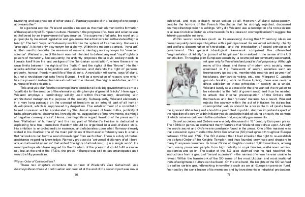 This analysis clarifies that cosmopolitans consider all existing governments as mere“ scaffolds for the erection of the eternally existing temple of general felicity”. Here again, Wieland employs a terminology widely used within freemasonry, describing with architectural metaphors the purpose of the society. Subsequently, Wieland elaborates in a very long passage on the concept of freedom as an integral part of all human development, which is suppressed by despotism. The establishment of a constitution based on reason will be accelerated by“ the utmost spread of basic truths, publicity of facts, observations, discoveries, investigations, suggestions of improvements, warnings of negative consequences”. Hence, cosmopolitans regard freedom of the press as the true“ Palladium of humanity” and the last part of Wieland’ s treatise is dedicated to explaining how true journalistic freedom should be organised in a well-civilized state. His ambition is encyclopaedic in essence, and elaborates upon what Ramsay already stated in his Oration: one of the main principles of the masonic fraternity was to enable that“ all nations can borrow sound knowledge” from each other. There is a duty of mutual assistance regarding knowledge. Ramsay proposed a“ universal dictionary of all liberal arts and all useful sciences” that united“ the lights of all nations […] in a single work”. He would perhaps also have argued for the freedom of the press that could fulfil a similar roll, but, at the end of the 1730s, the press in Europe was still not as emancipated as it would be fifty years later.