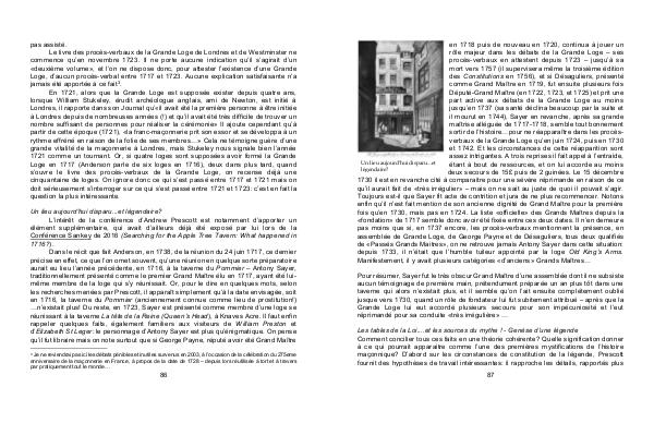 Dans le récit que fait Anderson, en 1738, de la réunion du 24 juin 1717, ce dernier précise en effet, ce que l’ on omet souvent, qu’ une réunion en quelque sorte préparatoire aurait eu lieu l’ année précédente, en 1716, à la taverne du Pommier – Antony Sayer, traditionnellement présenté comme le premier Grand Maître élu en 1717, ayant été luimême membre de la loge qui s’ y réunissait. Or, pour le dire en quelques mots, selon les recherches menées par Prescott, il apparaît simplement qu’ à la date envisagée, soit en 1716, la taverne du Pommier( anciennement connue comme lieu de prostitution!) … n’ existait plus! Du reste, en 1723, Sayer est présenté comme membre d’ une loge se réunissant à la taverne La tête de la Reine( Queen’ s Head), à Knaves Acre. Il faut enfin rappeler quelques faits, également familiers aux visiteurs de William Preston et d’ Elizabeth St Leger: le personnage d’ Antony Sayer est plus qu’ énigmatique. On pense qu’ il fut libraire mais on note surtout que si George Payne, réputé avoir été Grand Maître