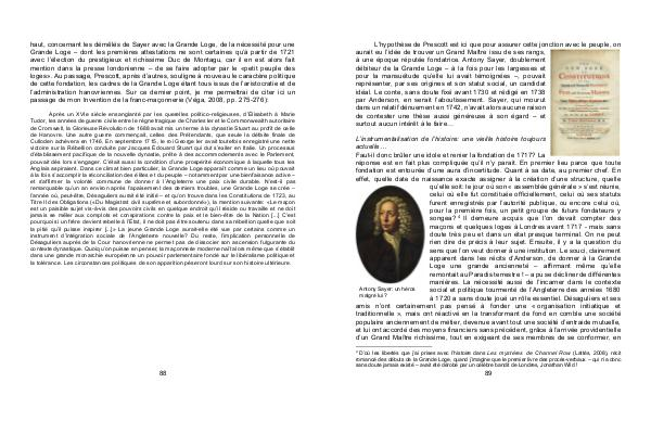 L’ instrumentalisation de l’ histoire: une vieille histoire toujours actuelle … Faut-il donc brûler une idole et renier la fondation de 1717? La réponse est en fait plus compliquée qu’ il n’ y parait. En premier lieu parce que toute fondation est entourée d’ une aura d’ incertitude. Quant à sa date, au premier chef. En effet, quelle date de naissance exacte assigner à la création d’ une structure, quelle qu’ elle soit: le jour où son « assemblée générale » s’ est réunie, celui où elle fut constituée officiellement, celui où ses statuts furent enregistrés par l’ autorité publique, ou encore celui où, pour la première fois, un petit groupe de futurs fondateurs y songea? 4 Il demeure acquis que l ' on devait compter des maçons et quelques loges à Londres avant 1717- mais sans doute très peu et dans un état presque terminal. On ne peut rien dire de précis à leur sujet. Ensuite, il y a la question du sens que l’ on veut donner à une institution. Le souci, clairement apparent dans les récits d’ Anderson, de donner à la Grande Loge une grande ancienneté – affirmant même qu’ elle remontait au Paradis terrestre! – a pu se décliner de différentes