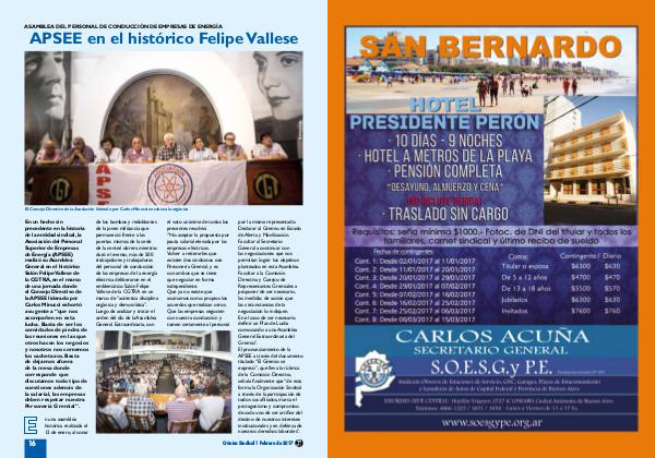 16 n una asamblea histórica realizada el 12 de enero, al sonar de los bombos y redoblantes de la joven militancia que permaneció frente a las puertas mismas de la sede de la central obrera mientras duró el evento, más de 500 trabajadores y trabajadoras del personal de conducción de las empresas de la energía eléctrica deliberaron en el emblemático Salón Felipe Vallese de la CGTRA en un marco de“ auténtica disciplina orgánica y democrática”. Luego de analizar y tratar el orden del día de la Asamblea General Extraordinaria, con el voto unánime de todos los presentes resolvió:“ No aceptar la propuesta por pauta salarial elevada por las empresas eléctricas. Volver a reiterarles que existen dos sindicatos con Personería Gremial, y es con ambos que se tiene que negociar en forma independiente. Que ya no existe que asumamos como propios los acuerdos que realizan otros. Que las empresas negocien con nuestra conducción y tomen seriamente al personal por la misma representado. Declarar al Gremio en Estado de Alerta y Movilización. Facultar al Secretario General a continuar con las negociaciones que nos permitan lograr los objetivos planteados en esta Asamblea. Facultar a la Comisión Directiva y Cuerpo de Representantes Gremiales a proponer de ser necesario, las medidas de acción que las circunstancias de la negociación lo indiquen. En el caso de ser necesario definir un Plan de Lucha convocando a una Asamblea General Extraordinaria del Gremio”. El pronunciamiento de la APSEE a través del documento titulado“ El Gremio se expresó”, que lleva la rúbrica de la Comisión Directiva, señala finalmente que“ de esta forma la Organización Sindical a través de la participación de todos sus afiliados, marca el protagonismo y compromiso de cada uno de ser artífice del destino de nuestros intereses institucionales y en defensa de nuestros derechos laborales”.