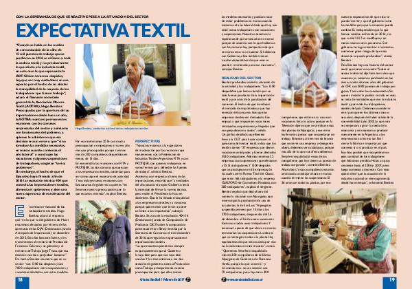 nuestras expectativas de que esto se pueda revertir y que el gobierno tome las medidas para que la situación pueda cambiar. Es indispensable que lo que hemos venidos sufriendo en 2016 y lo que va del 2017 se modifique y en marzo veamos otro panorama. Si el gobierno no logra reactivar el consumo, corremos grave riesgo de que esta situación se pueda profundizar”, atestó Benítez. Para Benítez hay una historia del sector textil que tomar en cuenta.“ Sobre el sector industrial, dije hace tres años que nosotros ya veníamos perdiendo en los tres o cuatro últimos años del gobierno de CFK casi 3000 puestos de trabajo por goteo. Y acá están las consecuencias. Sin querer mezclar la política ni nada en esto, se trata de realidades que vive la industria textil y por ende los trabajadores textiles del país. Debemos considerar en el país que en los últimos cinco o seis años, después de haber salido de la convertibilidad( año 2002) y que otra vez empezara a girar la rueda de la economía y se empezara a producir nuevamente en la Argentina, a los empresarios no les era tan fácil cerrar la fábrica e importar, así que convenía sí o sí producir en el país. Eso hizo posible que recuperáramos gran cantidad de los trabajadores que habíamos perdido. Hubo un pico creciente hasta el 2006 y 2007, pero luego comenzó a decrecer. Con esto quiero decir que la situación de la industria nacional se viene agravando desde hace tiempo”, se lamentó Benítez.