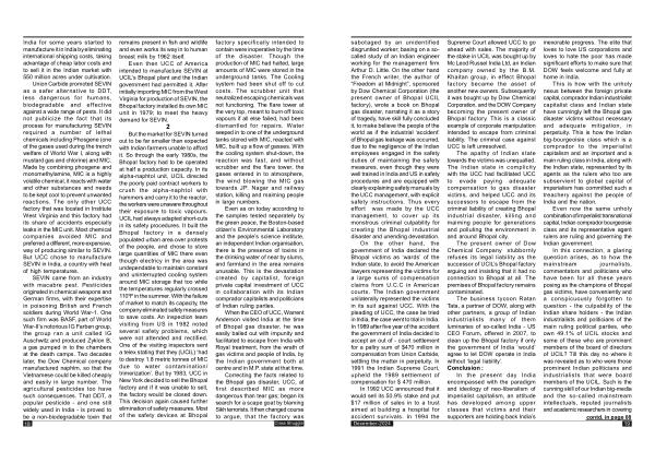 sabotaged by an unidentified disgruntled worker ; basing on a socalled study of an Indian engineer working for the management firm Arthur D . Little . On the other hand the French writer , the author of “ Freedom at Midnight ”, sponsored by Dow Chemical Corporation ( the present owner of Bhopal UCIL factory ), wrote a book on Bhopal gas disaster , narrating it as a story of tragedy , have skill fully concluded it , to make believe the people of the world as if the industrial ‘ accident ’ of Bhopal gas leakage was occurred , due to the negligence of the Indian employees engaged in the safety duties of maintaining the safety measures , even though they were well trained in India and US in safety procedures and are equipped with clearly explaining safety manuals by the UCC management , with explicit safety instructions . Thus every effort was made by the UCC management , to cover up its monstrous criminal culpability for creating the Bhopal industrial disaster and unending devastation .
