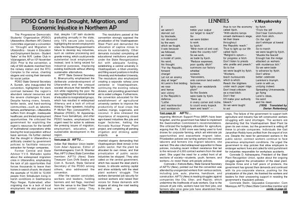 The Progressive Democratic Students ’ Organization ( PDSO ) Uttarandhra ( Northern AP ) District Committee organized a convention on “ Drought and Migration in Uttarandhra - Issues in Education and Employment Sectors - Student Tasks ” at the M . R . Ladies Club in Vizianagaram , AP on 15 th November 2024 . Prior to the convention , a rally of 500 students marched from the railway station and the RTC Complex to the venue , chanting slogans and voicing their demands for social justice .