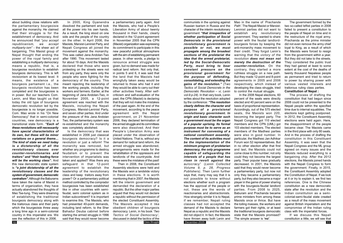 Mao in the name of‘ Prachanda Path’. The Nepali Maoist or Marxist- Leninist parties did not want to establish any revolutionary government. They wanted to share power with the feudal landlordbourgeois forces by keeping the anti-monarchy mass movement to their credit. They forgot Lenin’ s warning that the victory of the revolution does not mean not merely the destruction of the counter-revolution. On the contrary, they started a more ruthless struggle on a new path. But they made 12-point and 8-point agreements in 2005 and 2006 respectively, which instead of developing the class struggle, tried to control the mutual struggle.