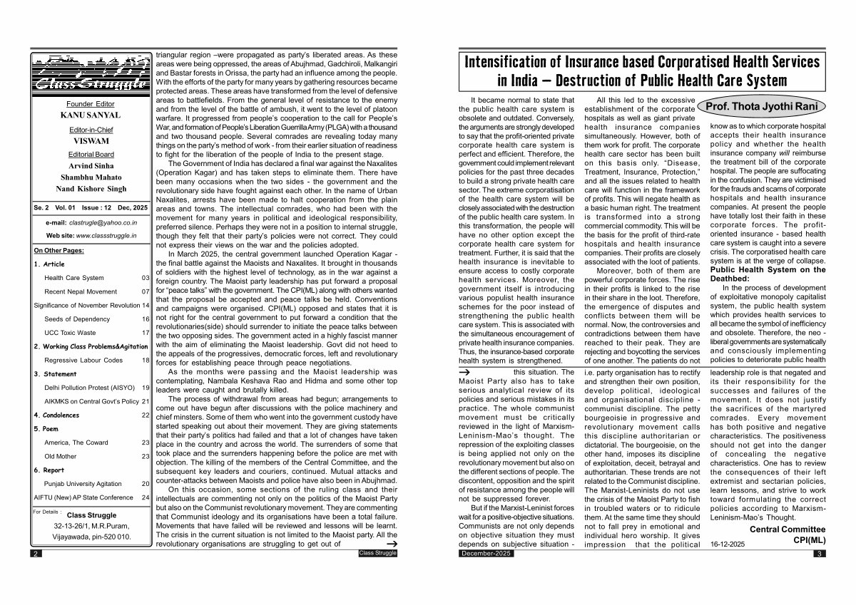In March 2025, the central government launched Operation Kagar- the final battle against the Maoists and Naxalites. It brought in thousands of soldiers with the highest level of technology, as in the war against a foreign country. The Maoist party leadership has put forward a proposal for“ peace talks” with the government. The CPI( ML) along with others wanted that the proposal be accepted and peace talks be held. Conventions and campaigns were organised. CPI( ML) opposed and states that it is not right for the central government to put forward a condition that the revolutionaries( side) should surrender to initiate the peace talks between the two opposing sides. The government acted in a highly fascist manner with the aim of eliminating the Maoist leadership. Govt did not heed to the appeals of the progressives, democratic forces, left and revolutionary forces for establishing peace through peace negotiations.