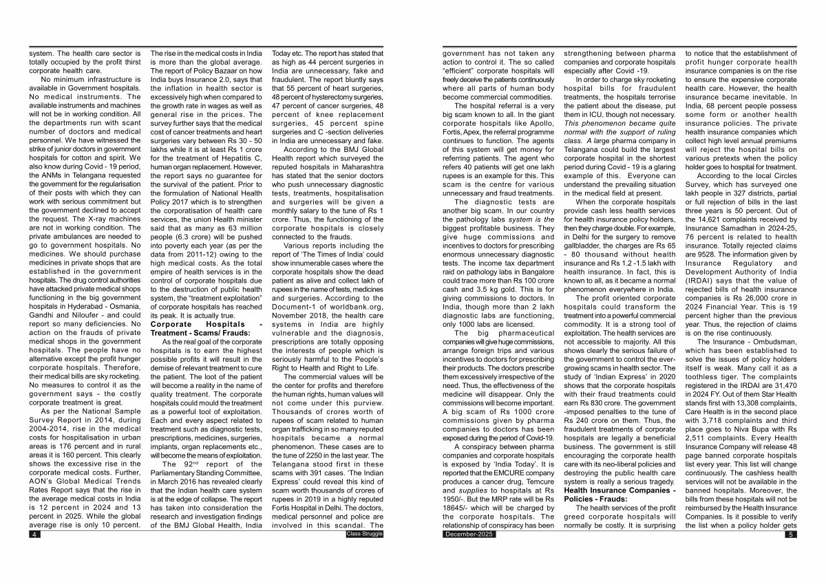 In order to charge sky rocketing hospital bills for fraudulent treatments, the hospitals terrorise the patient about the disease, put them in ICU, though not necessary. This phenomenon became quite normal with the support of ruling class. A large pharma company in Telangana could build the largest corporate hospital in the shortest period during Covid- 19 is a glaring example of this. Everyone can understand the prevailing situation in the medical field at present.