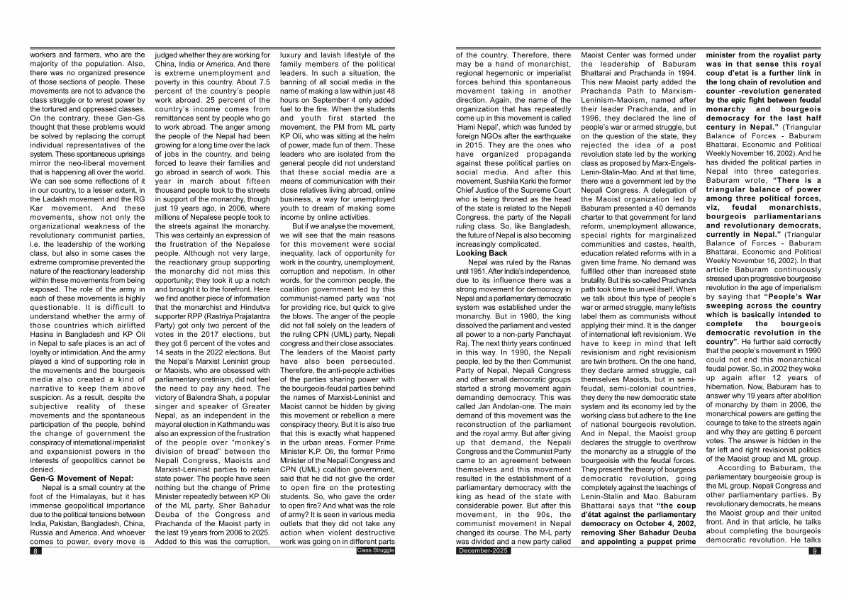 Nepal is a small country at the foot of the Himalayas, but it has immense geopolitical importance due to the political tensions between India, Pakistan, Bangladesh, China, Russia and America. And whoever comes to power, every move is 8 judged whether they are working for China, India or America. And there is extreme unemployment and poverty in this country. About 7.5 percent of the country’ s people work abroad. 25 percent of the country’ s income comes from remittances sent by people who go to work abroad. The anger among the people of the Nepal had been growing for a long time over the lack of jobs in the country, and being forced to leave their families and go abroad in search of work. This year in march about fifteen thousand people took to the streets in support of the monarchy, though just 19 years ago, in 2006, where millions of Nepalese people took to the streets against the monarchy. This was certainly an expression of the frustration of the Nepalese people. Although not very large, the reactionary group supporting the monarchy did not miss this opportunity; they took it up a notch and brought it to the forefront. Here we find another piece of information that the monarchist and Hindutva supporter RPP( Rastriya Prajatantra Party) got only two percent of the votes in the 2017 elections, but they got 6 percent of the votes and 14 seats in the 2022 elections. But the Nepal’ s Marxist Leninist group or Maoists, who are obsessed with parliamentary cretinism, did not feel the need to pay any heed. The victory of Balendra Shah, a popular singer and speaker of Greater Nepal, as an independent in the mayoral election in Kathmandu was also an expression of the frustration of the people over“ monkey’ s division of bread” between the Nepali Congress, Maoists and Marxist-Leninist parties to retain state power. The people have seen nothing but the change of Prime Minister repeatedly between KP Oli of the ML party, Sher Bahadur Deuba of the Congress and Prachanda of the Maoist party in the last 19 years from 2006 to 2025. Added to this was the corruption, luxury and lavish lifestyle of the family members of the political leaders. In such a situation, the banning of all social media in the name of making a law within just 48 hours on September 4 only added fuel to the fire. When the students and youth first started the movement, the PM from ML party KP Oli, who was sitting at the helm of power, made fun of them. These leaders who are isolated from the general people did not understand that these social media are a means of communication with their close relatives living abroad, online business, a way for unemployed youth to dream of making some income by online activities.