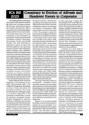 The Central government introduced the Forest ( Conservation ) Amendment Bill , 2023 in the Lok Sabha on March 29 th this year , which aims to amend the Forest Conservation Act , 1980 . It was put into force to arrest deforestation and provide for forest conservation . The bill has been sent to the Joint Committee of the Parliament by passing the Parliamentary Standing Committee on Science , Technology , Environment , Forest , and Climate Change . The Joint Committee is expected to submit its report with recommendations in the upcoming monsoon session of the Parliament . Earlier on October 2 , 2021 , MoEF & CC released a Public Consultation Paper and invited comments and feedback on the proposed amendments in the FCA , 1980 . Despite several opposition and criticism on the draft paper raised by the concerned citizens , the present FC Amendment Bill 2023 remains almost like a concise version of that draft which takes a significant portion of forests out of the purview of FCA , considers several non-forestry activities as forestry activities , overlooks Forest Rights Act 2006 and Gram Sabha consent and aims to build more centralized forest governance .