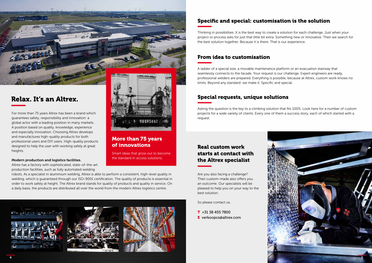 A ladder of a special size, a movable maintenance platform or an evacuation stairway that seamlessly connects to the facade. Your request is our challenge. Expert engineers are ready, professional welders are prepared. Everything is possible, because at Altrex, custom work knows no limits. Beyond any standard: we make it. Specific and special.