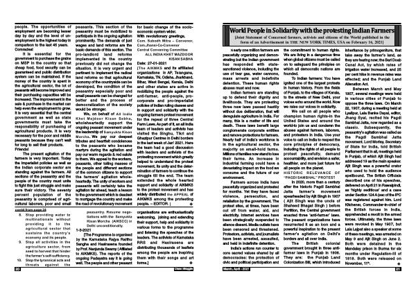 We , on behalf of All India Khet Majdoor Kisan Sabha , wholeheartedly support the ongoing peasant movement under the leadership of Samyukta Kisan Morcha . We pay our deepest tributes and heartfelt condolences to the peasants who became martyrs during the agitation and pay our warm regards & red salute to them . We appeal to the workers , peasants , other toiling masses of the people and different sections of the common citizens to support the farmers ’ agitation wholeheartedly . The unity of workers and peasants will certainly take the agitation far ahead , teach a lesson to the government which is deadest to mortgage the country and make the road of revolutionary movement
