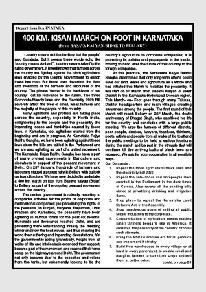 Many agitations and protests are taking place across the country , especially in North India , enlightening to the people and the peasantry the impending losses and hardships caused by these laws . In Karnataka , too , agitations started from the beginning and are in progress . As Karnataka Rajya Raithu Sangha , we have been agitating against these laws since the bills are tabled in the Parliament and we are also agitating as part of a united movement . The Karnataka Rajya Raithu Sangha has been a part of many protest movements in Bangalore and elsewhere in support of the peasant movement in Delhi . On 23 rd January , hundreds of farmers and labourers staged a protest rally in Bellary with bullock carts and tractors . We have now decided to undertake a 400 km March on foot from Basava kalyan ( Bidar ) to Bellary as part of the ongoing peasant movement across the country .