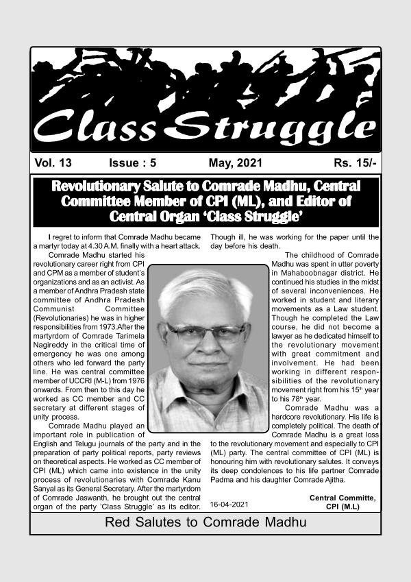 Vol . 13 Issue : 5 May , 2021 Rs . 15 / - Revolutionary Salute to Comrade Madhu , Central Committee Member of CPI ( ML ), and Editor of Central Organ ‘ Class Struggle ’