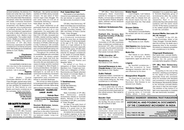 It is remarkable that he lived as a Communist revolutionary leader for more than six decades from the age of 15 till his last breath at the age of 78 . Com . Madhu ’ s death is a huge setback to the revolutionary movement , especially to the CPI ( ML ) party . CPI ( ML ) New Democracy , AP State Committee extends its deepest condolences on the death of Comrade Madhu . Deepest condolences to his revolutionary companion and life partner , comrade Padma and daughter Ajitha .