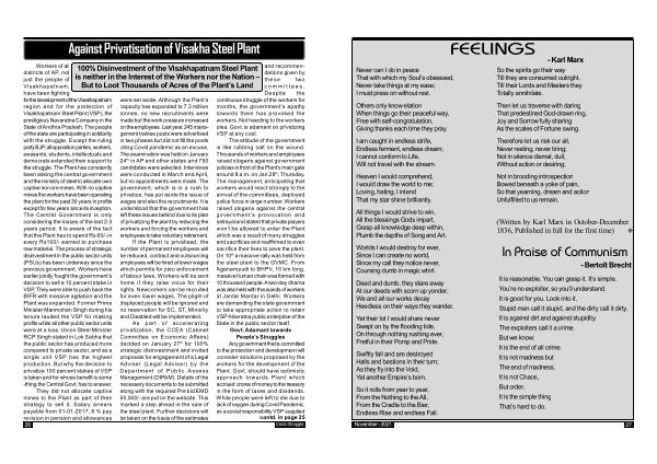 100 % Disinvestment of the Visakhapatnam Steel Plant is neither in the Interest of the Workers nor the Nation – But to Loot Thousands of Acres of the Plant ’ s Land contd . in page 25