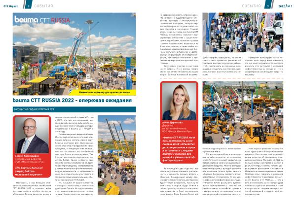 Признаюсь , у нас большие ожидания от предстоящей выставки bauma CTT RUSSIA 2022 , и , конечно , ждём выставку bauma в октябре этого года в Мюнхене . Бурное развитие рынка и продаж строительной техники в России в 2021 году даёт все основания прогнозировать высокую активность наших экспонентов и большой интерес посетителей к bauma CTT RUSSIA в этом году .