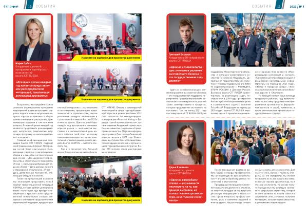 CTT MINING . Вместе с планируемой экспозицией в сфере горнодобывающей отрасли в рамках выставки 2022 года состоится 2-я международная конференция « Future of Mining ― Будущее горной промышленности », организованная Академией горных наук России совместно с журналом « Горная промышленность ». Первая конференция в рамках Дня горнодобывающей отрасли прошла в 2021 году . Спикерами выступили более 35 представителей ведущих компаний и организаций в горнодобывающей отрасли . Более 200 человек стали участниками мероприятия .
