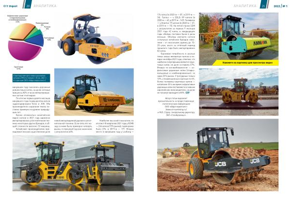 Оценивая потребность в разных типах новых импортных катков в январе-сентябре 2021 года , отметим , что наиболее популярными являются грунтовые катки , их доля составила 47 %. Вторые по востребованности ― асфальтовые дорожные катки ( гладковальцовые и комбинированные ), за ними 35 % рынка . У тротуарных только 10 %, у пневмошинных и ручных по 4 %. Более половины грунтовых катков ― китайские . В то же время асфальтовые дорожные катки поставляют в основном европейские производители , на долю их техники приходится 83 %.